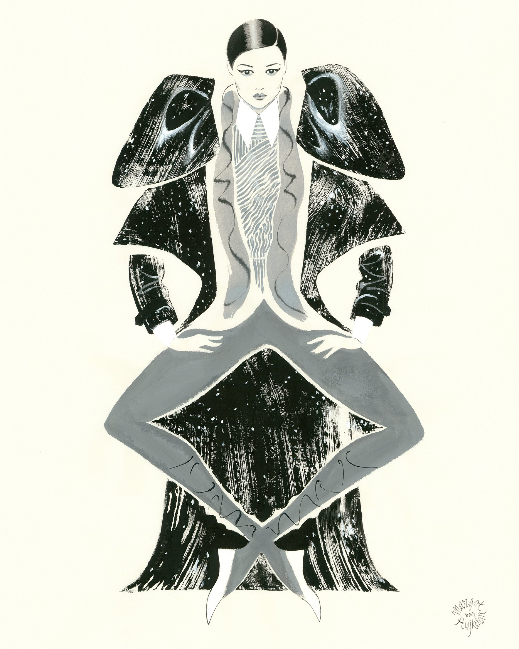 After graduating from the ArtEz Fashion Academy in Arnhem in 1990, Margot van Huijkelom left for Paris to work as a fashion illustrator. She develops a fondness for Japan and spends several years there. This resulted in many commissions for her, including Japanese Vogue and l'Officiel Japan. She also works for Harrods Magazine and Journal le Monde, for which she draws interpretations of the shows of Dior, Valentino and Chanel during the Haute Couture Shows. Her drawings on handmade paper depict fashionable women, seductive and powerful at the same time.